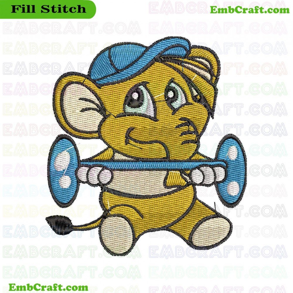 The image features an embroidery of a character resembling a young tiger engaging in exercise, using multiple thread colors and shades to highlight details.
